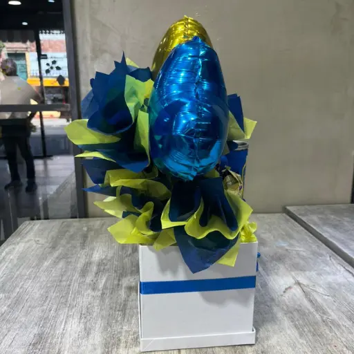 Este elegante box incluye un balde metálico con el escudo CABJ, acompañado por una selección de chocolates Arcor y decorado con una impactante combinación de globos metalizados en azul y dorado, incluyendo globos en forma de corazón que realzan la presentación y le dan un look premium y festivo.