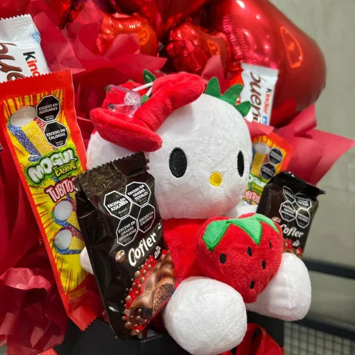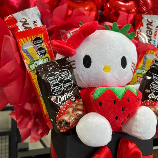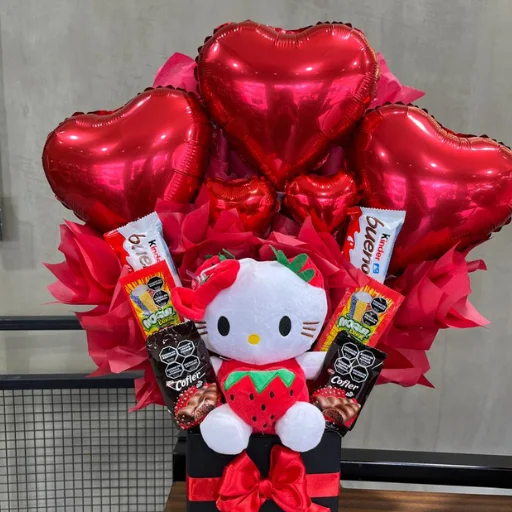 Un regalo adorable y lleno de ternura que conquista corazones desde el primer momento. Este box combina la dulzura de Hello Kitty en versión peluche temática de frutilla, con una exquisita selección de chocolates importados y un toque romántico gracias a los globos metálicos en forma de corazón.