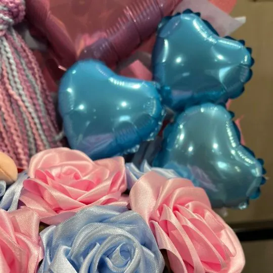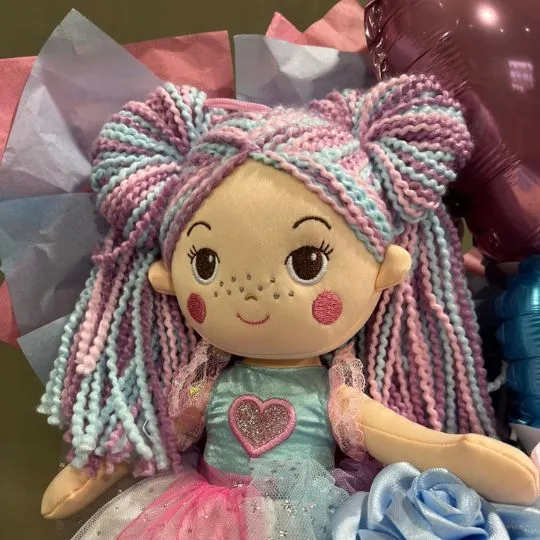 Sorprendé con un regalo que combina ternura, color y emoción. Este exclusivo box de regalo incluye una encantadora muñeca de trapo con cabello trenzado en tonos pastel, acompañada por rosas de raso premium en celeste y rosa y un conjunto de globos metalizados en forma de corazón que aportan un toque mágico y festivo.