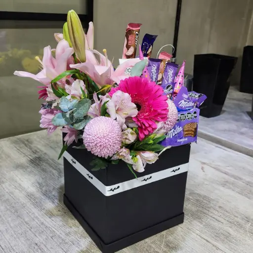 Una combinación que enamora a todos los sentidos. Este elegante box negro contiene una armoniosa mezcla de flores frescas de estación en tonos suaves y vibrantes, acompañadas por una exquisita selección de chocolates: Kinder Bueno, Bon o Bon, Arcor y Milka.