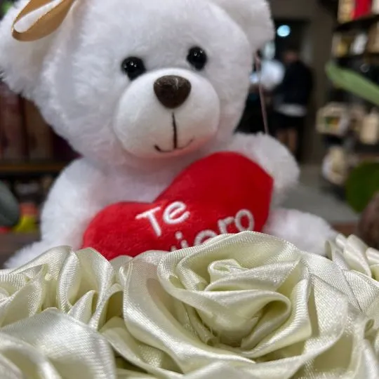 Este encantador arreglo combina la elegancia de las rosas blancas eternas con la ternura de un osito de peluche que sostiene un corazón con la frase “Te amo”, creando un regalo perfecto para transmitir amor puro y emociones sinceras.