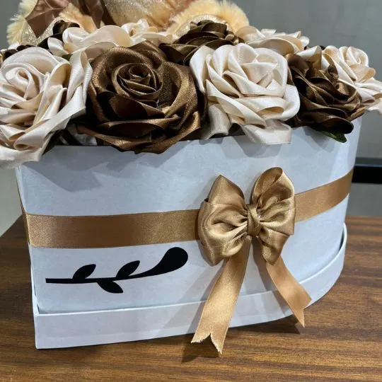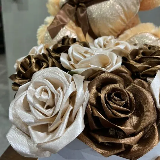Sorprendé con un regalo elegante, delicado y lleno de ternura. Este hermoso box de regalo incluye un adorable oso de peluche color miel, que sostiene un corazón con moño, acompañado por un exquisito arreglo de rosas eternas de raso hechas a mano en tonos marfil y dorado, que conservan su belleza intacta con el paso del tiempo.