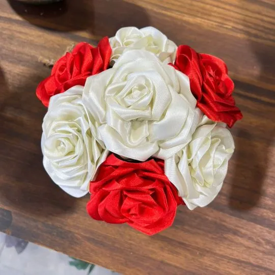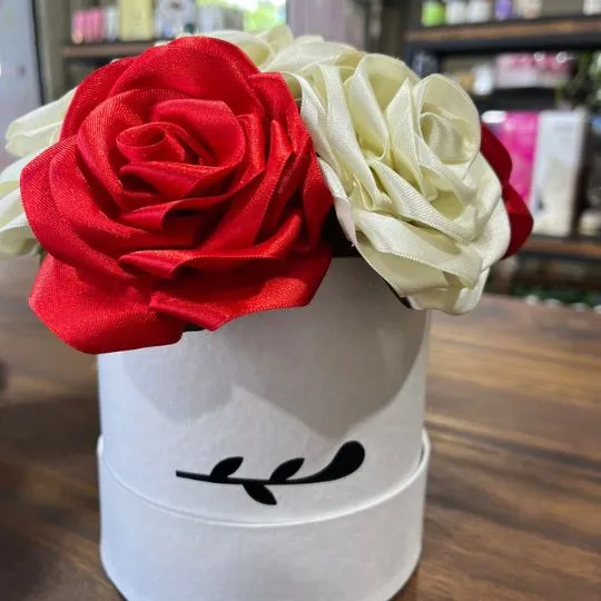 Caja pote lite con rosas de raso rojas y blancas