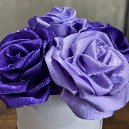Caja pote lite con rosas de raso violetas y lavanda