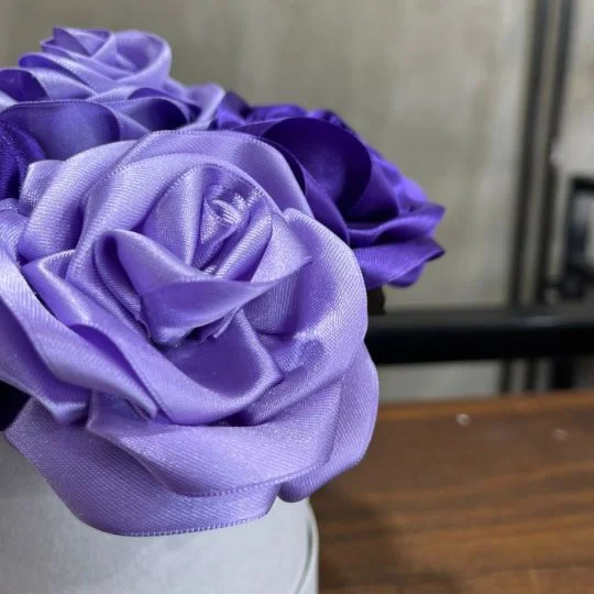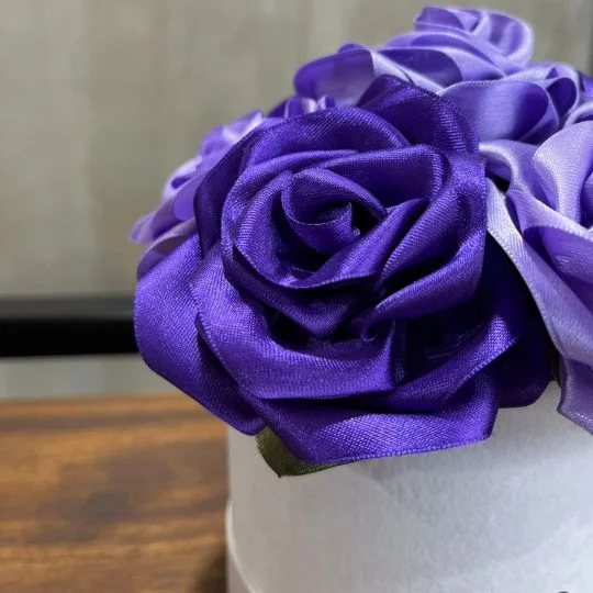 Este delicado box floral combina rosas de tela satinada en tonos violeta y lavanda, creando un arreglo sofisticado, moderno y lleno de personalidad. Los tonos púrpura simbolizan admiración, creatividad y amor profundo, lo que lo convierte en un regalo único y diferente.