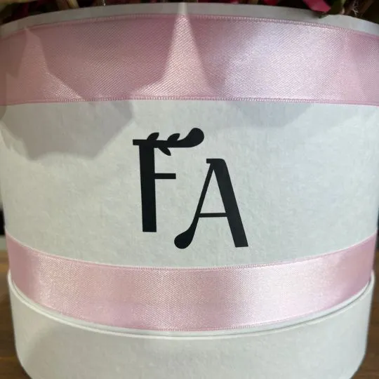 El arreglo se presenta en una caja rígida blanca tipo sombrerera, decorada con cinta de raso rosa y el logo FA (Flores Avenida), ideal para regalar directamente sin necesidad de envoltorio adicional.