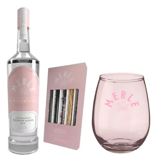 El set se presenta en una caja de diseño premium en color rosa, con ventana frontal que deja ver el contenido, lo que lo convierte en un regalo atractivo desde el primer momento. Además, incluye un vaso exclusivo Merle, ideal para servir el gin con hielo y disfrutarlo con estilo.