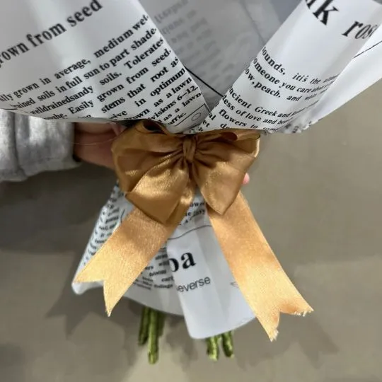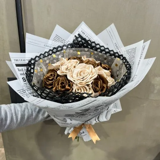 El ramo viene envuelto en un papel estilo periódico vintage, combinado con tul negro con detalles dorados y una malla decorativa que realza aún más su presentación, creando un diseño moderno y sofisticado que no pasa desapercibido.