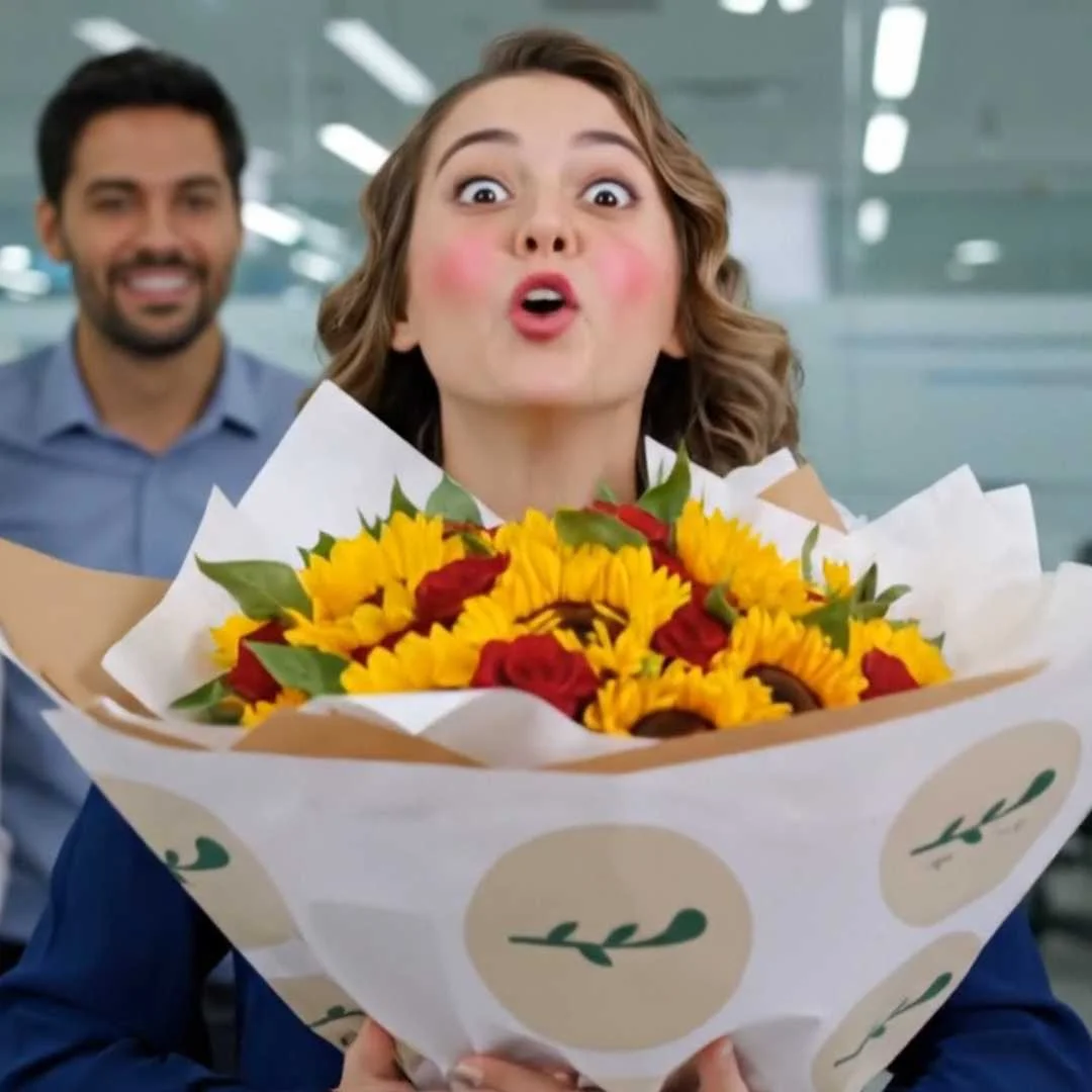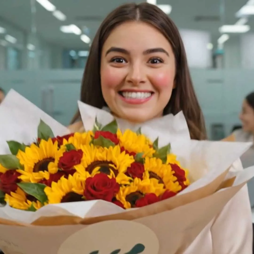 Delicado ramo XL de 30 rosas rojas y 18 girasoles. Perfecto para regalar en cualquier ocasion.