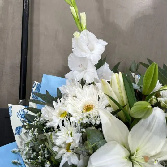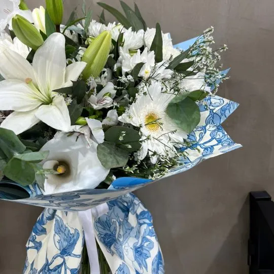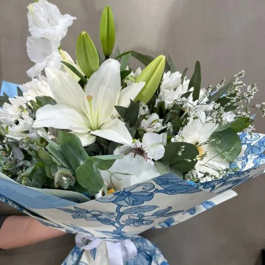 Descubrí la delicadeza del Ramo Blanco Puro, una combinación perfecta de lilium blancos, gerberas, crisantemos, eucaliptos y finos follajes que aportan frescura, armonía y un estilo moderno inigualable. Su presentación con papeles en tonos celestes y blancos resalta aún más la pureza de las flores, convirtiéndolo en un regalo elegante y sofisticado para cualquier ocasión especial.