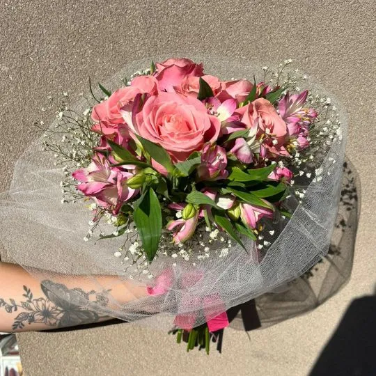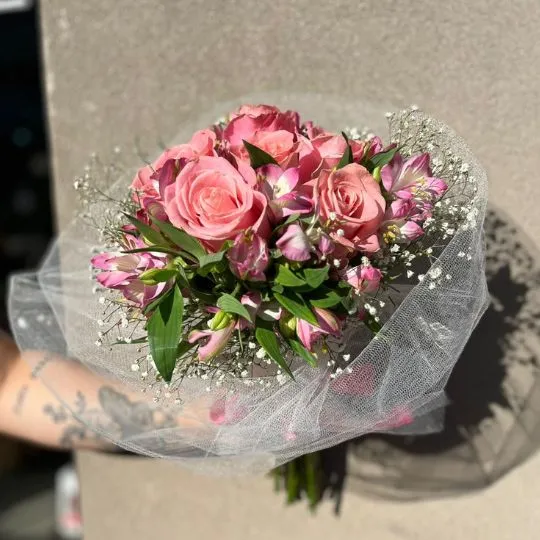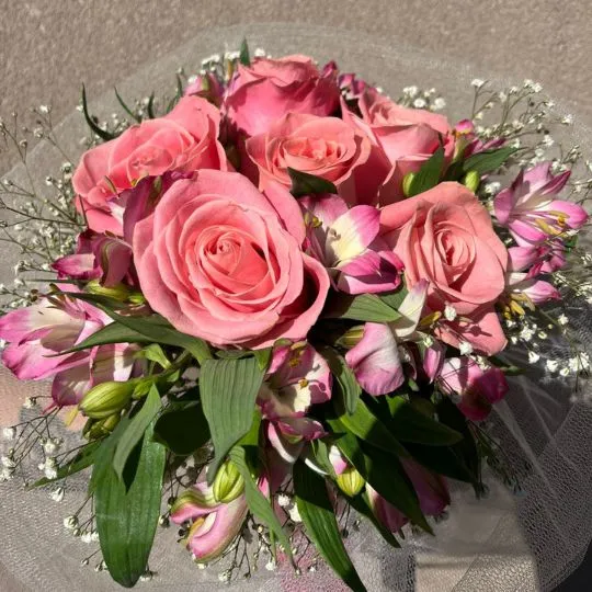 Está confeccionado con rosas importadas rosadas, combinadas con alstroemerias en tonos pastel y un delicado halo de paniculata (velo de novia) que aporta suavidad y un estilo etéreo. Cada flor se selecciona minuciosamente para asegurar frescura, armonía y una presentación impecable.