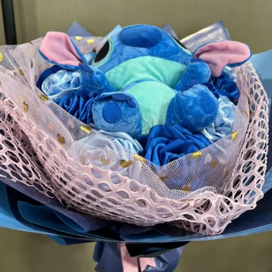 Este espectacular ramo es ideal para quienes aman los detalles originales y tiernos. Incluye un adorable muñeco Stitch de peluche, rodeado por un delicado arreglo de rosas hechas a mano con cinta de raso, en una combinación de tonos azules que lo hacen único y súper llamativo.