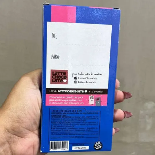 Tableta de chocolate de la linea lattechocolate de 60 gr sabor a mani con chocolate. Cada tableta con una frase diferente especialmente pensada para enamorar. Podes escribir tu dedicatoria en el dorso del packaging.