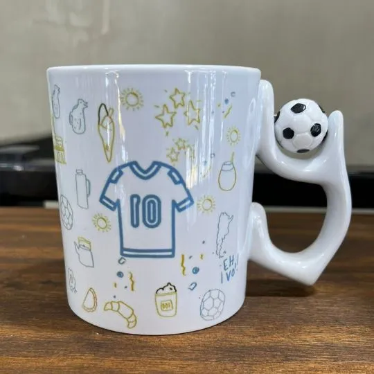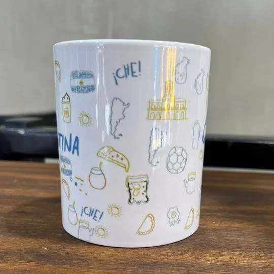 Sumá alegría y pasión albiceleste a cada desayuno con esta increíble taza temática de Argentina, ideal para amantes del fútbol y de nuestra cultura. Su diseño incluye ilustraciones típicas argentinas y un detalle único: una mini pelota en el asa, que la convierte en un regalo original, divertido y súper especial.