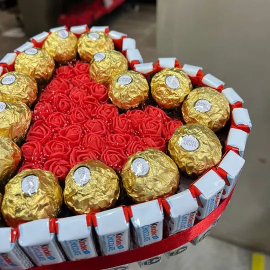 Torta corazon kinder rocher con rosas eternas