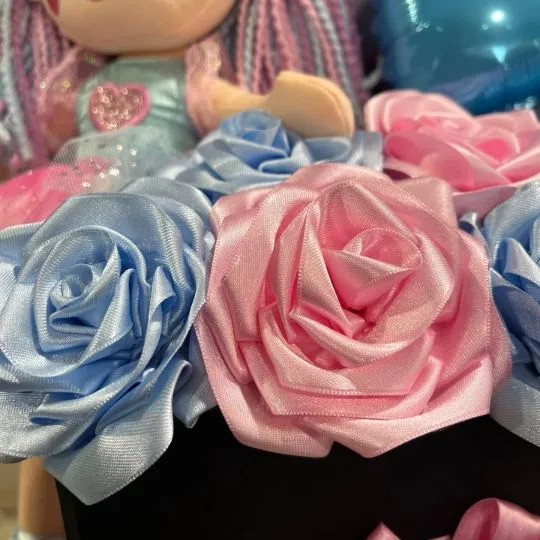 Sorprendé con un regalo que combina ternura, color y emoción. Este exclusivo box de regalo incluye una encantadora muñeca de trapo con cabello trenzado en tonos pastel, acompañada por rosas de raso premium en celeste y rosa y un conjunto de globos metalizados en forma de corazón que aportan un toque mágico y festivo.