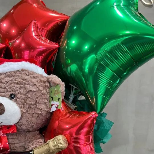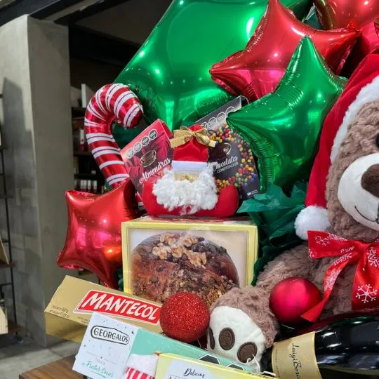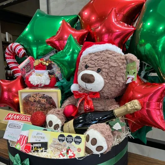 Este combo incluye un tierno oso navideño con gorrito de Papá Noel, globos metalizados en rojo y verde que le dan un toque único y decorativo, pan dulce 100 Ducados, chocolates, golosinas temáticas, un espumante para brindar y una selección de productos dulces ideal para compartir.