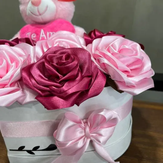 Las flores están realizadas en tela satinada de alta calidad, por lo que no se marchitan y pueden conservarse como recuerdo para siempre. Todo viene presentado en una caja rígida decorativa, con moño de raso y detalles románticos que la hacen ideal para regalar en cualquier ocasión especial.