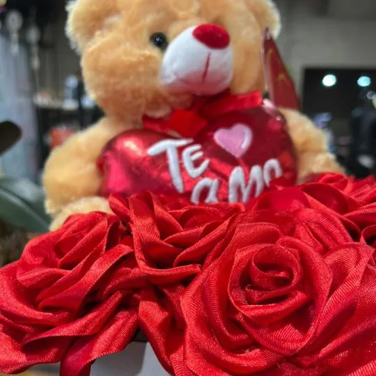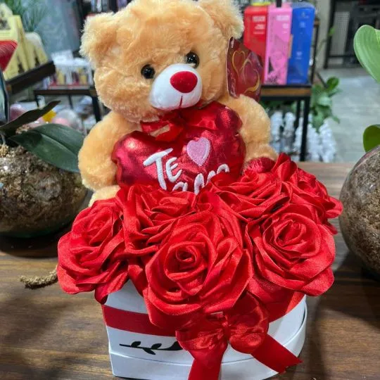 Este hermoso box combina la intensidad de las rosas rojas eternas con la ternura de un osito de peluche que sostiene un corazón con la frase “Te amo”, creando un regalo perfecto para enamorar y emocionar desde el primer instante.