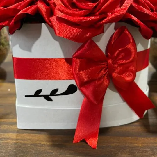 Las rosas, diseñadas para mantener su belleza por mucho tiempo sin marchitarse, están presentadas en una caja rígida blanca de estilo premium, decorada con cinta y moño de raso rojo, que realza el contraste y le da una presentación elegante y romántica.