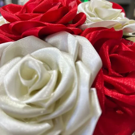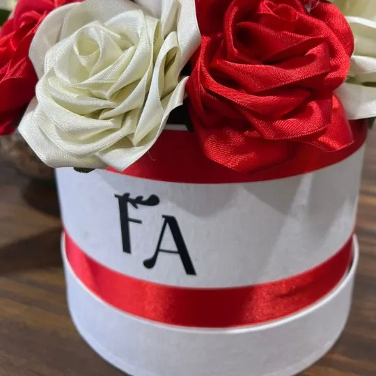 Este elegante box floral está compuesto por un delicado arreglo de rosas de raso en una combinación armoniosa de rosas rojas y blancas, creando un efecto visual sofisticado, romántico y moderno.