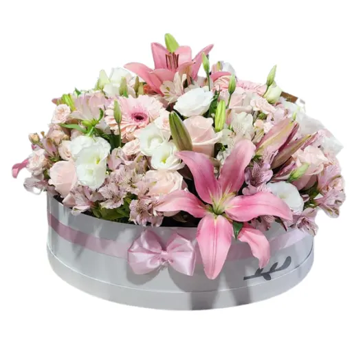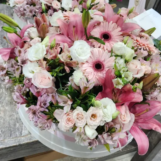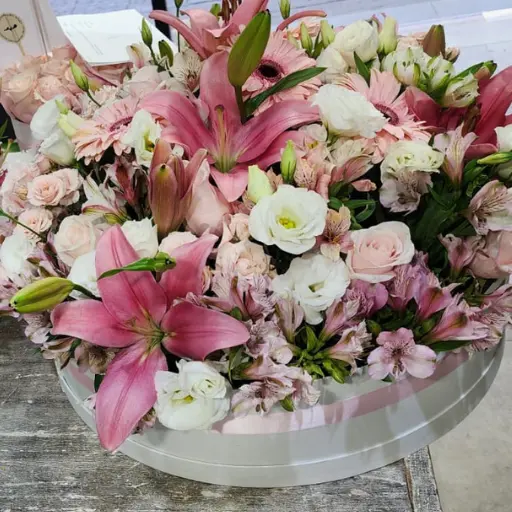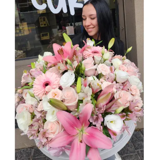 n arreglo majestuoso que combina elegancia y frescura en su máxima expresión. Este pote blanco XL reúne una abundante selección de flores naturales en tonos rosados y crema —rosas, liliums, gerberas y lisianthus— cuidadosamente dispuestas para crear un efecto romántico, delicado y sofisticado.