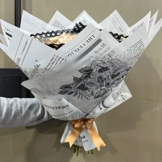 El ramo viene envuelto en un papel estilo periódico vintage, combinado con tul negro con detalles dorados y una malla decorativa que realza aún más su presentación, creando un diseño moderno y sofisticado que no pasa desapercibido.