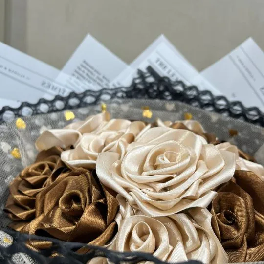 Este elegante ramo está compuesto por rosas de raso hechas a mano, en una delicada combinación de tonos champagne, beige y dorado, que transmiten lujo, romanticismo y distinción. Cada rosa está cuidadosamente confeccionada para lograr un acabado realista, suave al tacto y visualmente impactante.