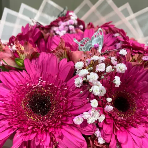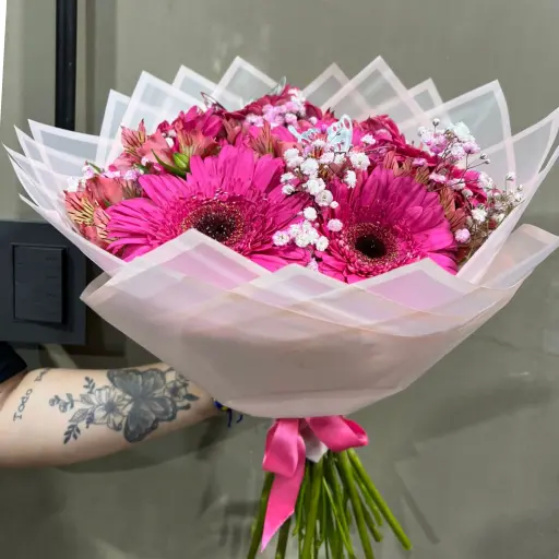 Compuesto por gerberas fucsias, astromelias rosadas y delicadas gypsophilas blancas, este diseño transmite alegría, dulzura y energía positiva.