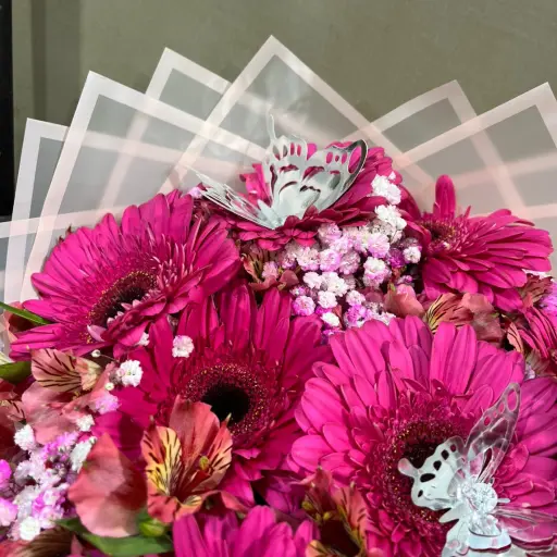 Ramo de flores gerberas y astromelias con papel coreano y maripo