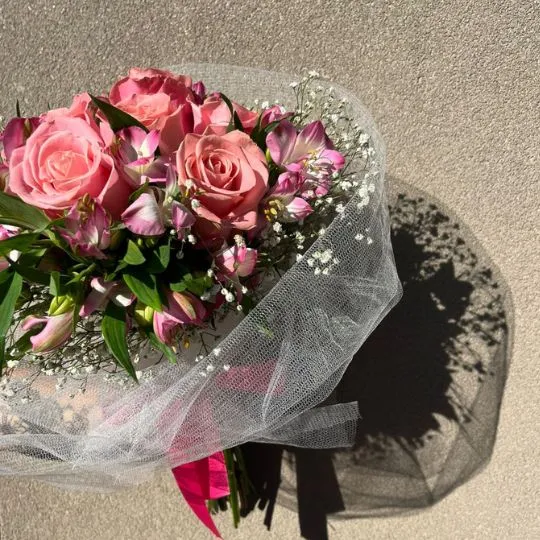 Está confeccionado con rosas importadas rosadas, combinadas con alstroemerias en tonos pastel y un delicado halo de paniculata (velo de novia) que aporta suavidad y un estilo etéreo. Cada flor se selecciona minuciosamente para asegurar frescura, armonía y una presentación impecable.